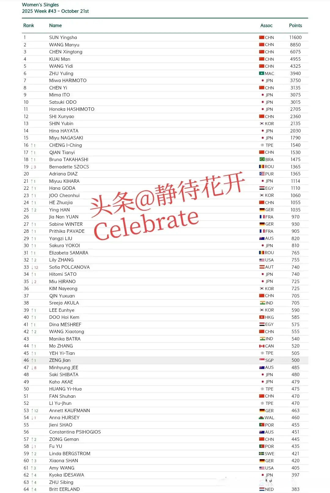中国澳门选手朱雨玲积3940分排名第六,日本选手张本美和3750分排名第七,国乒选手陈熠积3135分排名第八,日本选手伊藤美诚积3075分排名第九,大藤沙月积3015分保持第10。