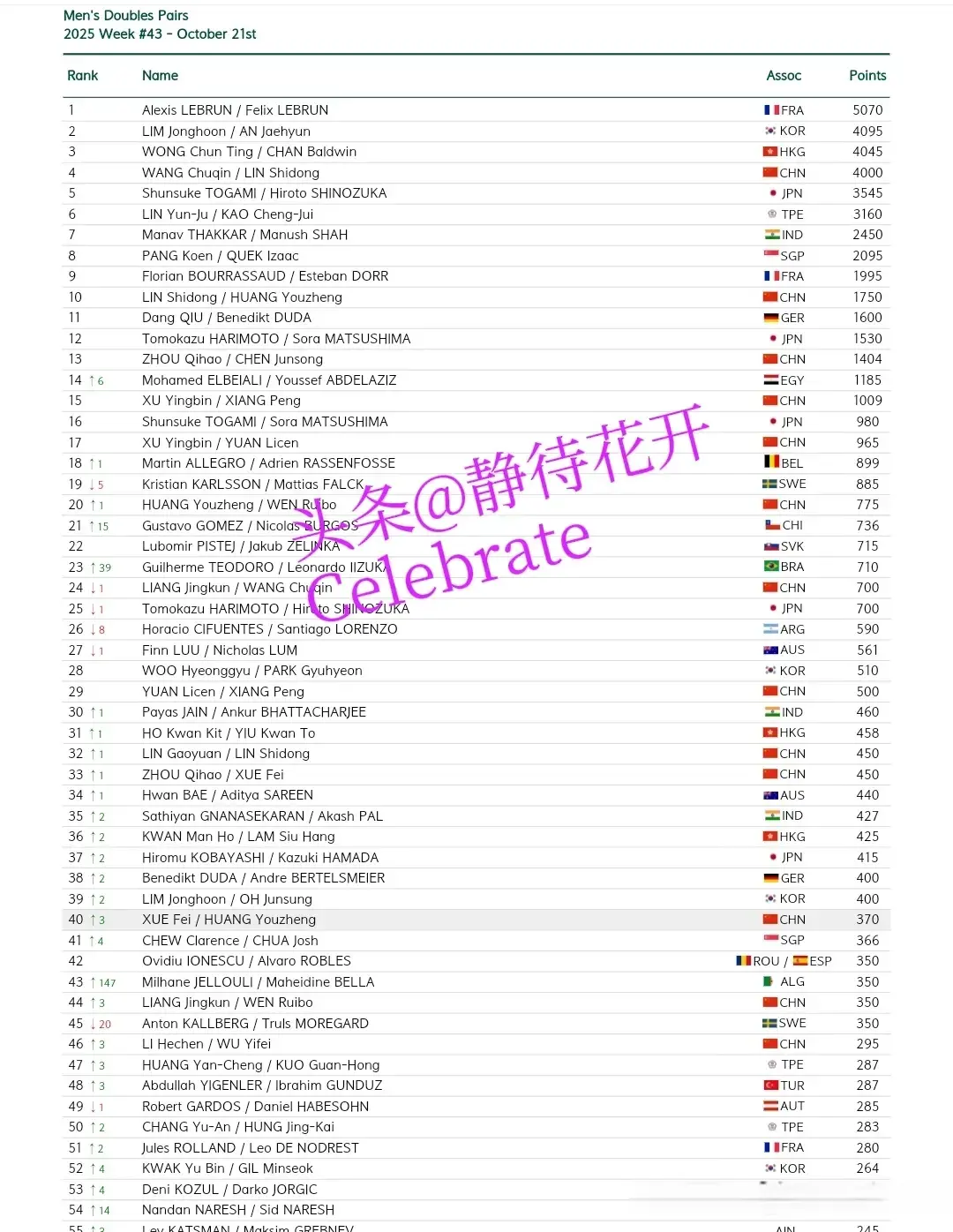 清掉去年欧锦赛男双冠军积分,法国勒布伦兄弟目前积5070分,继续排名第一,