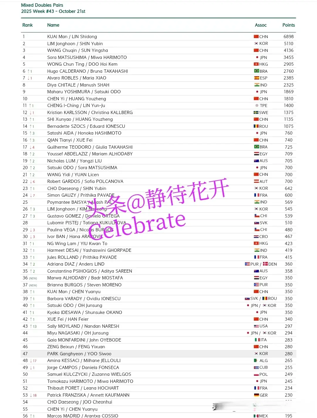 西班牙组合罗伯勒斯/肖瑶茜清掉去年欧锦赛混双冠军积分,世界排名下降一位,排在第7位,