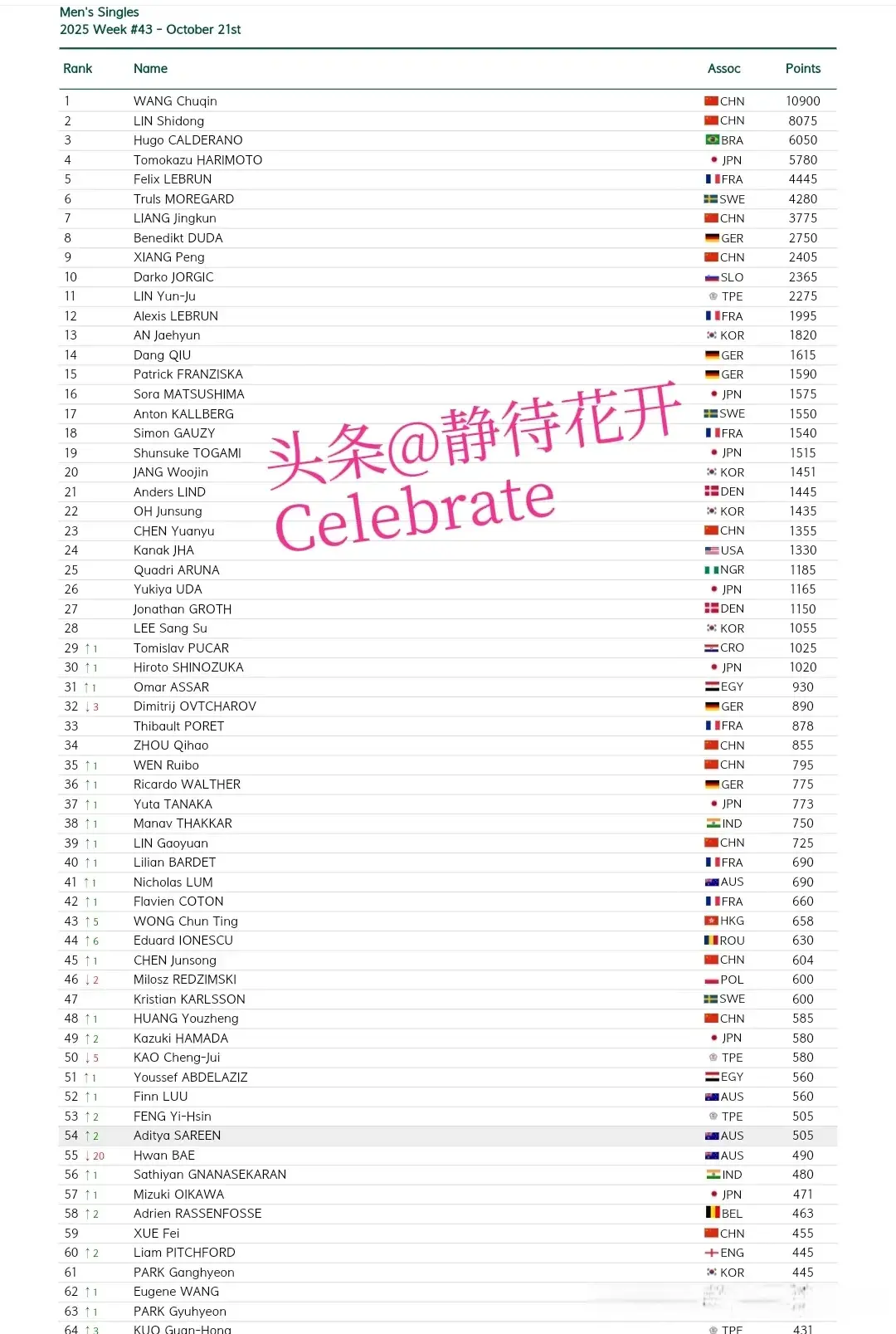 目前王楚钦仍然以10900分高居榜首,林诗栋积8075分稳居第二,
