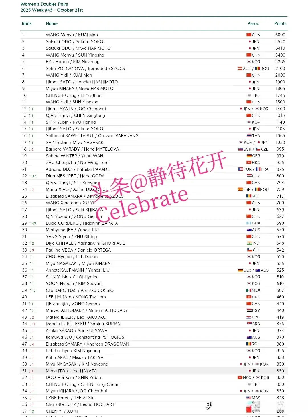 日本组合大藤沙月/横井咲樱3520分排名第二,